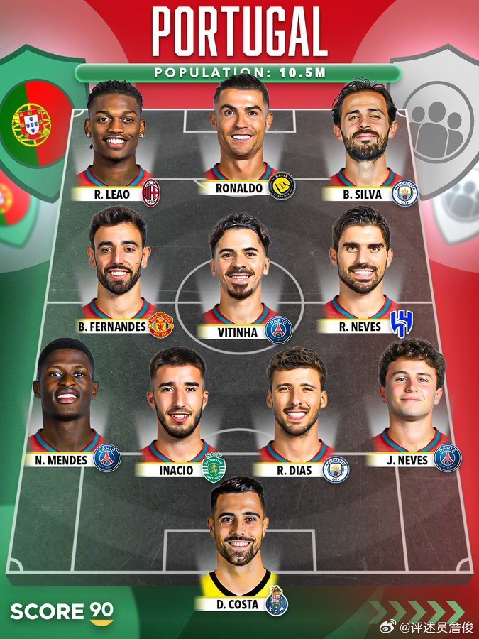 #詹俊评葡萄牙最强阵# 对于外媒给出的葡萄牙最强阵首发,@评述员詹俊 给出了自己的见解:“外媒眼中葡萄牙国家队的最强首发。个人觉得一个位置应该会调整:这个赛季在曼城努内斯已经成功转型为右后卫,当然他的防守能力还需要进一步提升,但相信已经能够在国家队拿到主力位置。这样一来,若昂-内维斯可以回到中场与维蒂尼亚、B费组成强大的中场“三叉戟”。贝-席是多面手,能参与中场轮换也能客串右边锋,切尔西的内托也是左右边锋的竞争人选。”你们心中葡萄牙的最佳首发阵容是什么样的呢?